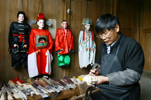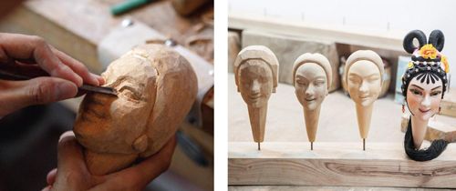 制作提线木偶的工序比较复杂,经过初步雕刻制作成粗胚之后还要进行打磨、粉彩,加盖粉土,抛光,做成之后,还要在木偶的头部钉上一枚竹制头钉,如此这般,提线木偶才算做成。