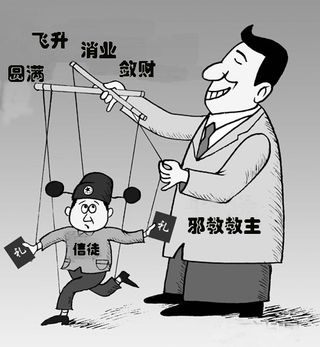 邪教组织控制信徒的手段比操控木偶要高明的多,花样百出,可以说是无所不用其极。邪教组织不仅通过建立金字塔型的严密组织对信徒进行控制,还运用多种恐吓手段给信徒钉上头钉,戴上紧箍咒,要求成员上面让干什么就干什么,让怎么干就怎么干。成员不敢过多地打听内幕,更无从知道真相,心理产生恐惧,慢慢丧失个体性情,成为“神”的奴隶。李洪志鼓吹人的归宿有两种,一个是天堂,一个是地狱,修炼大法的都能去天堂。这些谬论虽然荒唐可笑,但使一些信徒产生了强烈的恐怖感,他们宁可自己吃点亏,受点苦,失去点钱财,也不敢对“法轮功”有丝毫的怀疑。