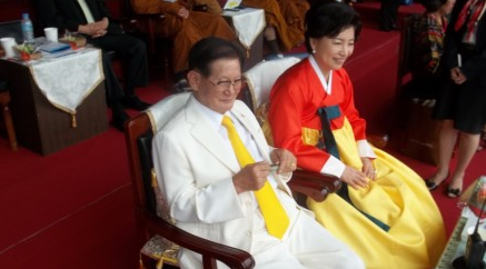 2012年,李万熙和情妇金南熙出现在“新天地”邪教在韩国举办的所谓“世界和平运动大会”现场的“最高主席”位置上,观看大会团体操表演(照片来源:互联网)