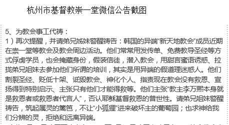 【凯风网2016年7月6日消息,记者:厉洁,通讯员:江枫】近日,杭州市基督教崇一堂发布公告,告诫信众警惕韩国邪教“新天地教会”。公告称,“新天地”成员在崇一堂等教会及教会周边活动,拉拢信众加入邪教,请弟兄姐妹警醒,拒绝和远离异端。