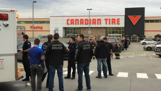 11月10日下午三时许,一名身形巨大着迷彩服的男子闯入温哥华市Bentall St. 2830号的Canadian Tire店,企图抢夺店内枪械,并刺伤一名店员。逃走时又挟持一名82岁顾客为人质,到场警员与他肉搏,其中一名警员被刺中数刀,伤及其头部。最后警员连开多枪,将歹徒击毙。