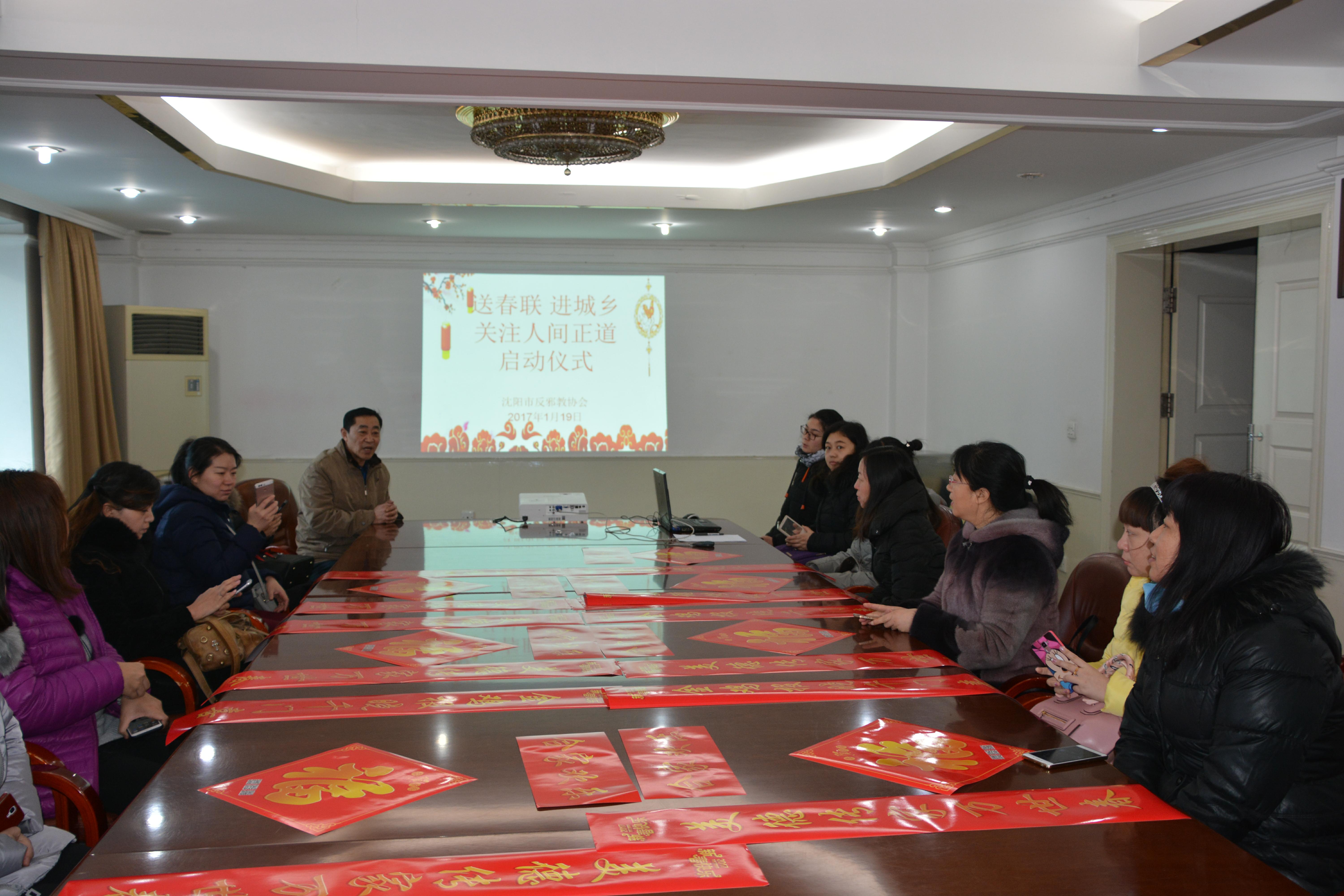 2017年1月19日,沈阳市反邪教协会举办“送春联进城乡,关注《人间正道》网”启动仪式,来自和平、于洪、康平等13个区县(市)的反邪教志愿者,代表沈阳市8000余名社区群众领取了由辽宁省反邪教协会赠送的春联和“福”字。启动仪式结束后,沈阳市反邪教协会来到和平区,向该区反邪教协会和水源地社区分别赠送了200副春联和“福”字,并现场指导居民扫描“人间正道”二维码和关注“两微”平台。